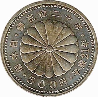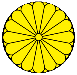 - L'emblème national du Japon (ci-dessus) se confond avec celui de son maître, l'Empereur, car il s'agit du sceau impérial du Japon, également appelé "le sceau du chrysanthème" (菊 纹 kikumon) ou "le Noble insigne du chrysanthème" (菊花 纹, 菊花 纹章 kikukamon, kikukamonshō). Cet emblème est un mon, un symbole héraldique à part entière, spécifique à la culture et à l'histoire japonaise, tout à fait comparable dans ses origines guerrières, sa fonction et ses codes, au blason occidental que nous connaissons bien, et dont l'étude est absolument passionnante, de surcroit. Ce mon est utilisé pour représenter les membres de la famille impériale japonaise depuis la période Kamakura (XIIe siècle) et est généralement considéré comme l'emblème national japonais. Il est décliné en trois versions principales : à seize pétales doubles : le mon impérial par excellence, à seize pétales simples (passeports et badges) et à quatorze pétales doubles (pour les membres de la famille impériale, ci-dessous).