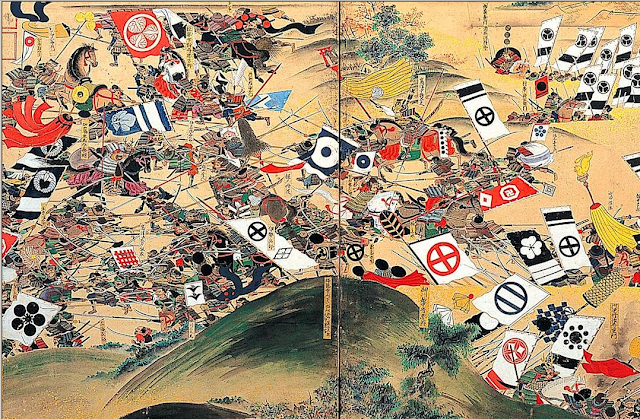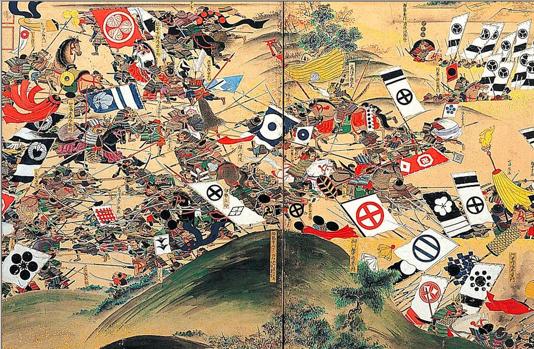 | extrait d'une réplique du tableau de la bataille de Sekigahara (1600) exécutée au XIXe siècle avec de nombreuses différences par rapport à l'original de 1620. Elle est conservée aux archives historiques de la ville de Sekigahara, préfecture de Gifu. (vous pouvez admirer l'ensemble → ICI , en agrandissant l'image du tableau ) |
