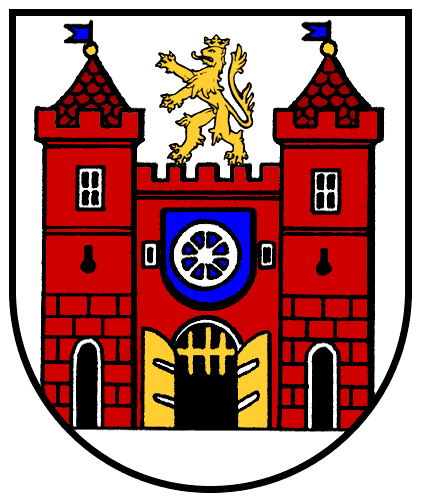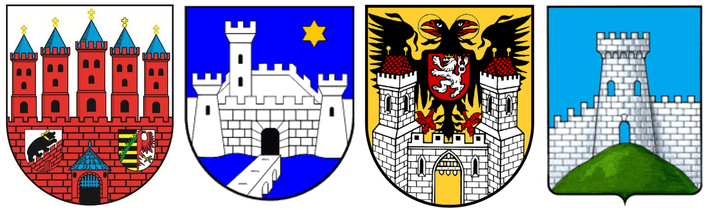 • l'utilisation fréquente des murs, portes de ville et tours de fortifications, que l'on nomme improprement "châteaux" y compris dans le langage héraldique. Ils sont une caractéristique récurrente de l'héraldique municipale en Europe centrale, héritée des anciens sceaux de villes qui circulaient au Moyen-Âge (voir un de mes anciens articles ici → ◙)